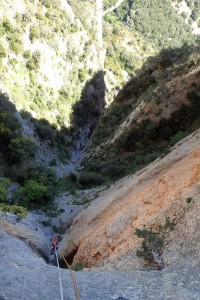 Un primer rápel de apenas 3 metros para quitar el roce y facilitar la recuperación da acceso a una reunión colgada (2 spits) para rapelar por una canal (35 m). Al final de la canal, al salir al vacío encontramos la primera cabecera colgada (2 personas máximo) de la vertical de 90 metros fraccionada en 60+30 según la guía (aunque nos dio la impresión de que el primer rápel medía algo menos).